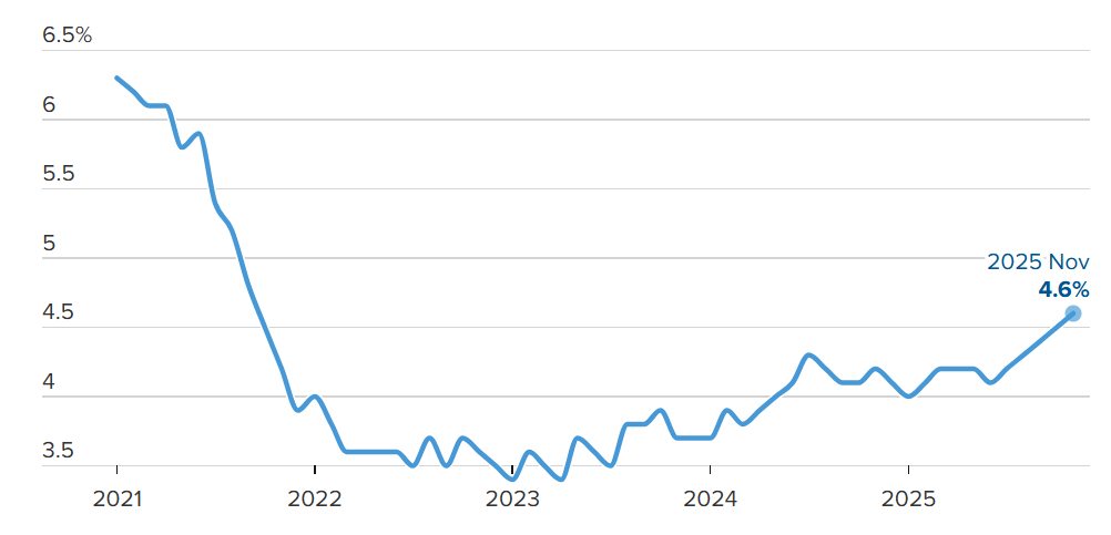 11月的失业率升至4.6%,高于预期,是自2021年9月以来的最高水平。