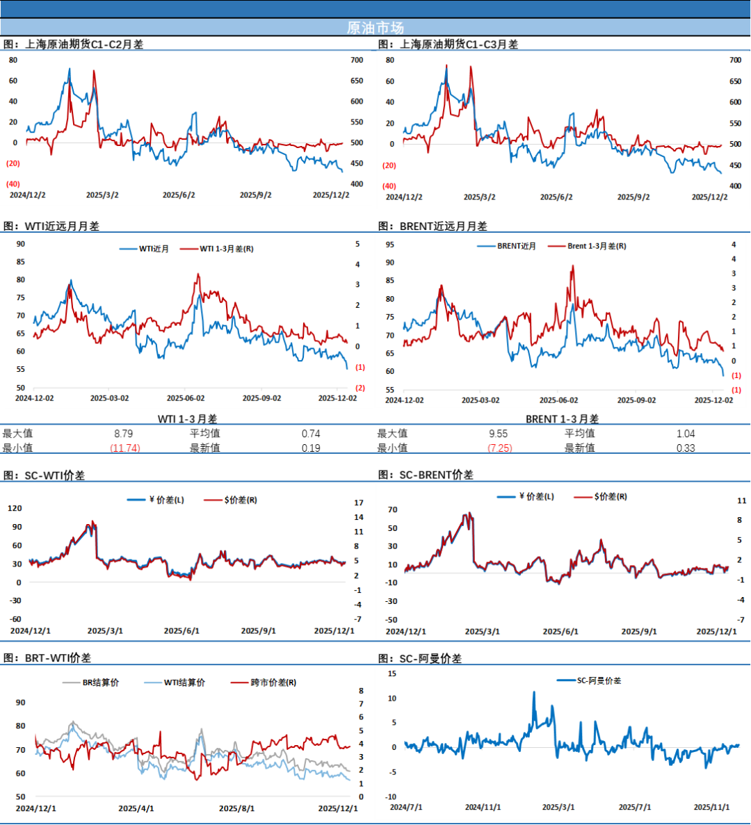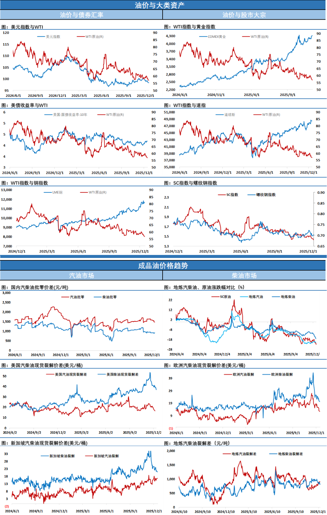 事实上包括我们在内的诸多机构都在持续提醒下原油市场四季度后将迎来供应过剩压力最为集中的阶段,12月11日EIA公布的月报大幅上修了过去2个月原油市场的供应过剩压力日均超400万桶/日,这也印证了多方高频数据显示的原油市场不断累积的库存。而12月以来欧洲市场为代表的柴油裂解差快速回落,完全回吐了对俄制裁带来的扰动,这也意味着地缘、制裁等因素的影响逐渐弱化。近期美国扣押运输委内瑞拉原油的油轮,让委内瑞拉石油出口陷入瘫痪,市场对此也反映平淡,进一步证实了地缘等题材已经难以对抗供应过剩这一利空带来的下行压力,在这样的背景下油价关键支撑纷纷被击破,在我国SC原油率先刷新年内低点之后,周三布伦特原油也失守了60美元关口,而如果只看收盘价,欧美原油也在周三刷新了年内最低收盘价。