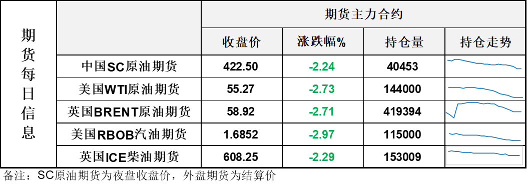 【1】WTI主力原油期货收跌1.55美元,跌幅2.73%,报55.27美元/桶;布伦特主力原油期货收跌1.64美元,跌幅2.71%,报58.92美元/桶;INE原油期货收跌2.24%,报422.5元。