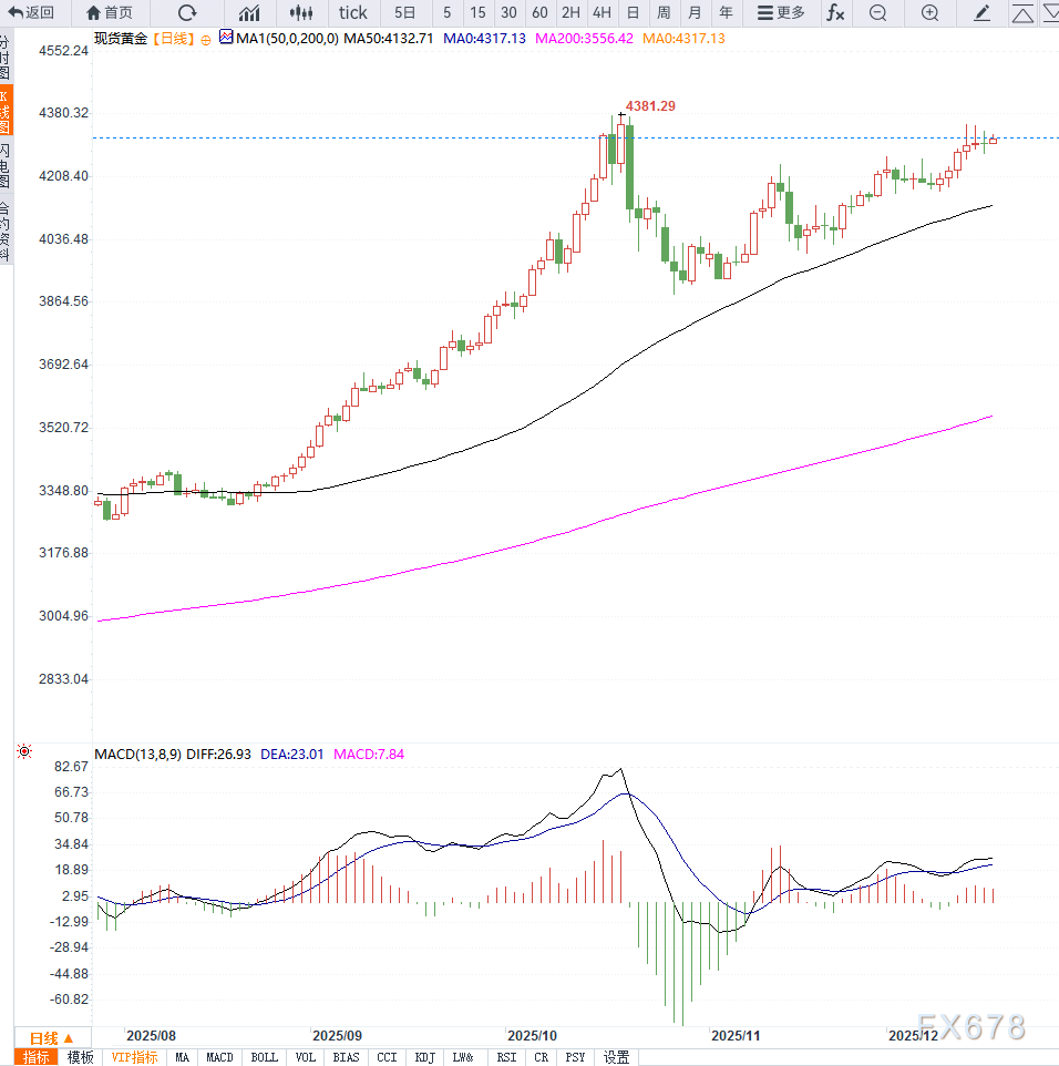 从技术面来看,黄金价格在日线和4小时图上均显示多头趋势保持。在日线图上,黄金稳居关键均线之上,RSI位于50上方,动能偏多。上方阻力位在4350美元(12月15日高点)和历史高位4381美元,下方支撑位分别是4270美元和4230美元。