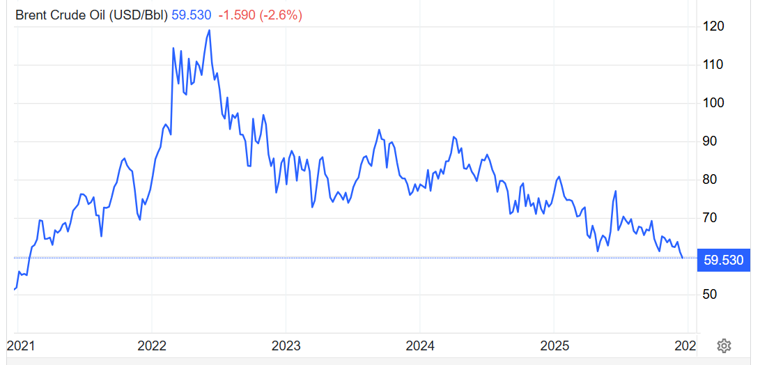 在美国总统特朗普通过下令封锁南美洲国家近海地区的受制裁油轮,并且加大对委内瑞拉军事与经济施压之后,国际原油定价基准——布伦特原油期货价格从2021年以来的最低价格水平迅速反弹,但是反弹幅度相对有限,仅仅徘徊在1%涨幅附近。