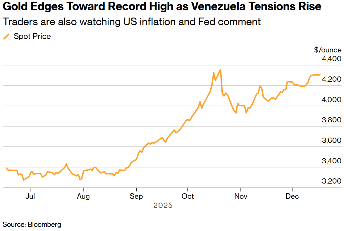 委内瑞拉的事态发展也提振了金价,美国总统特朗普下令封锁所有受制裁的油轮。在该地区军事集结和地面打击威胁的背景下,特朗普正在加大对委内瑞拉总统尼古拉斯·马杜罗的压力。