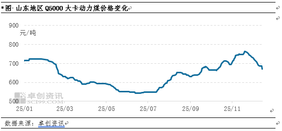 而进入2025年后半段,在国内反内卷、反超产等政策支撑下,国内煤矿生产受到一定限制,同时部分时间主产区集中降雨,露天矿生产被迫中止,国内煤炭产量有所收紧;而下半年国内陆续迎来迎峰度夏、迎峰度冬用煤高峰季,同时经过上半年持续去库,用煤企业煤炭库存下滑明显,集中采购需求陆续释放,且贸易商投机意愿也较上半年出现明显增长,需求端对市场支撑增强,国内煤炭供需宽松格局得到修复,国内煤炭价格重心整体上移,但在煤价不断刷新年内新高后,由于需求端对高价抵触,且贸易商锁定利润去库,市场供需格局趋于宽松,煤价开启承压回调,截至12月16日,山东动力煤市场Q5000大卡动力煤到厂价格为665-675元/吨,较年内价格低点上涨127.5元/吨,涨幅23.50%;较年内价格高点下降92.5元/吨,降幅12.13%。