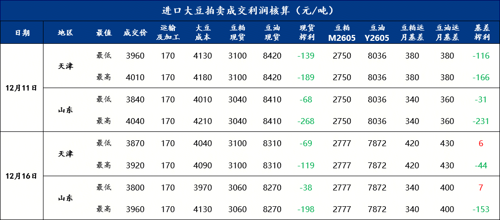 从进口大豆拍卖成交利润核算来看,对应的远月基差压榨利润普遍负值,普遍在-30至-230元/吨之间。以拍卖成交价核算,油厂仍面临“即期亏损”压力,豆粕现货价格3040-3100元/吨难以覆盖“大豆成本+运输加工”后的完全成本。仅仅12月16日天津和山东分别以最低价3870和3800元/吨核算榨利才处于盈亏线水平。且近期连粕M2605处于2750附近波动,并未提供良好的套盘空间。