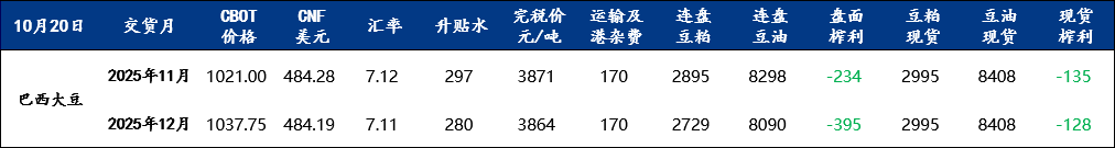 无论是前期采购的巴西大豆,还是近期竞拍的储备大豆,加上运输及加工费用后,大豆完全成本均超过4000元/吨。油厂以华北05+400(一口价3150)和山东05+340(一口价3090)出售豆粕基差合同,实际上已处于亏损状态。且在当前大豆供应充足、部分油厂面临豆粕胀库和催提压力的背景下,现有基差价格仍处于相对偏高区间,存在一定的下行风险。若后续市场承接力不足或供应压力持续,油厂将普遍陷入“保本困境”,行业整体利润空间预计将进一步收窄。