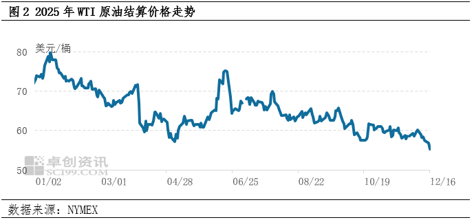原油期价连续回落。一方面,美国最新经济数据显示,11月失业率从4.4%上升到4.6%,经济放缓预期导致市场避险情绪升温。另一方面,近日俄乌局势缓和,原油地缘溢价回吐,叠加市场对欧佩克+可能增产的担忧持续存在,进一步压制油价走势。截至12月16日收盘,WTI原油价格下跌至55.27美元/桶,单日跌幅超2.5%。国际油价持续走弱,导致生物燃料的经济性下降,从而使植物油需求存在减弱预期,利空植物油市场,导致棕榈油价格承压。