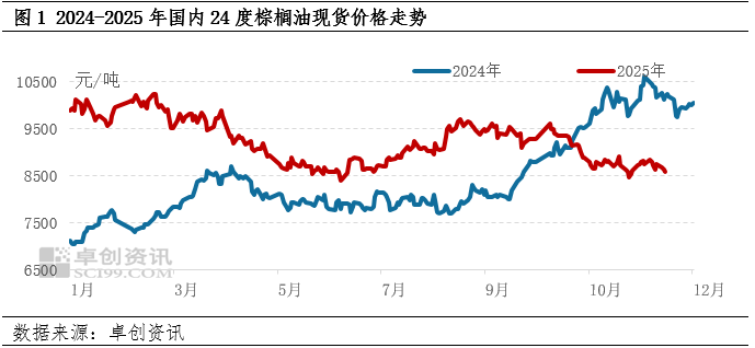 在原油增产预期、美生柴政策延期及澳菜籽到港等利空因素驱动下,国际油价及相关植物油价格宽幅回落施压棕榈油市场。另外,棕榈油仍呈供强需弱格局,市场多重利空叠加导致现货价格连续下跌。目前国内植物油市场缺乏明确利多消息提振,预计12月棕榈油现货价格承压但跌幅放缓,春节前存在走强预期。