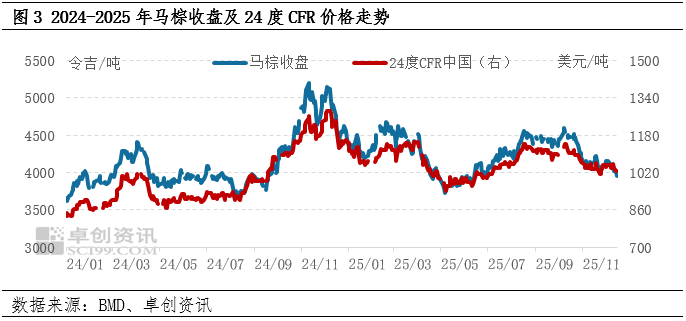 据机构数据显示,12月前15日马棕产量环比下降2.97%,同期出口量环比下滑约16%。尽管马来西亚棕榈油产量环比小幅下滑,但降幅有限,对市场形成的利多支撑较弱。同时在出口持续疲软的背景下,市场普遍预期12月马棕库存将出现累积,进一步对棕榈油价格构成压力。截至12月16日,马棕主力合约收于3957令吉/吨,较本月3日的高点下跌199令吉/吨,跌幅4.79%;24度棕榈油外盘价格参考1025美元/吨,较月内高点回落25美元/吨,跌幅2.38%。
