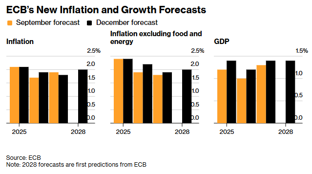 与此同时,随决议一同发布的最新预测显示,经济扩张将更为稳健,而通胀在未来两年低于目标水平后,将于2028年回到2%。欧洲央行在声明中表示,最新评估“再次确认通胀将在中期内稳定在2%的目标水平”。