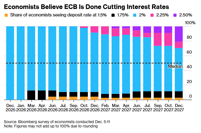 在另一项调查中,经济学家也普遍预计欧元区政策利率可能维持在当前水平直至2027年。不过,并非所有央行都是如此。英国央行周四早些时候选择降息25个基点,美联储也在上周宣布降息25个基点,且这两家央行都可能在明年进一步放松政策。在此情况下,欧元兑英镑、欧元兑美元汇率可能将获得支撑。