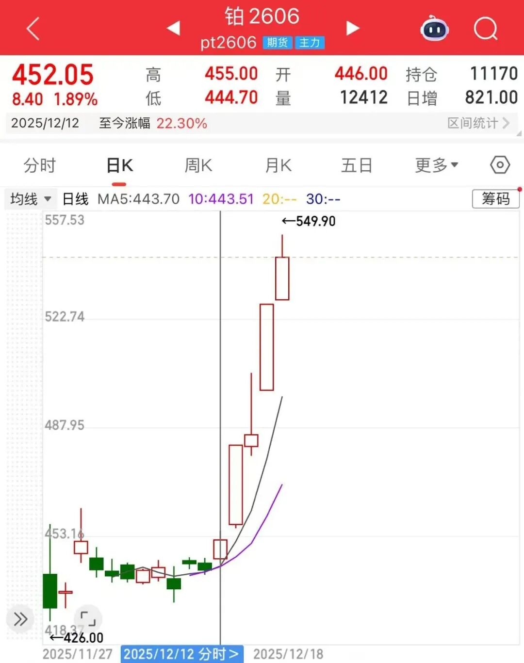 12月18日,铂、钯期货延续强劲走势。截至当日午盘收盘,铂期货主力2606合约报542.65元/克,上涨5.32%;钯期货主力2606合约报476.6元/克,上涨6.99%。12月12日至今,铂、钯期货价格均已涨逾20%。