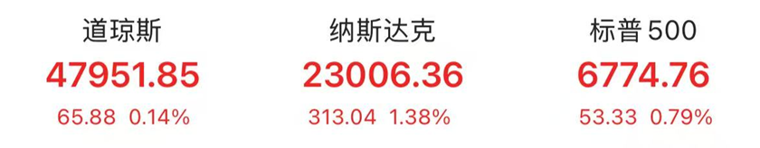 截至收盘,道琼斯指数涨0.14%,报47951.85点;标普500指数涨0.79%,报6774.76点;纳斯达克指数涨1.38%,报23006.36点。