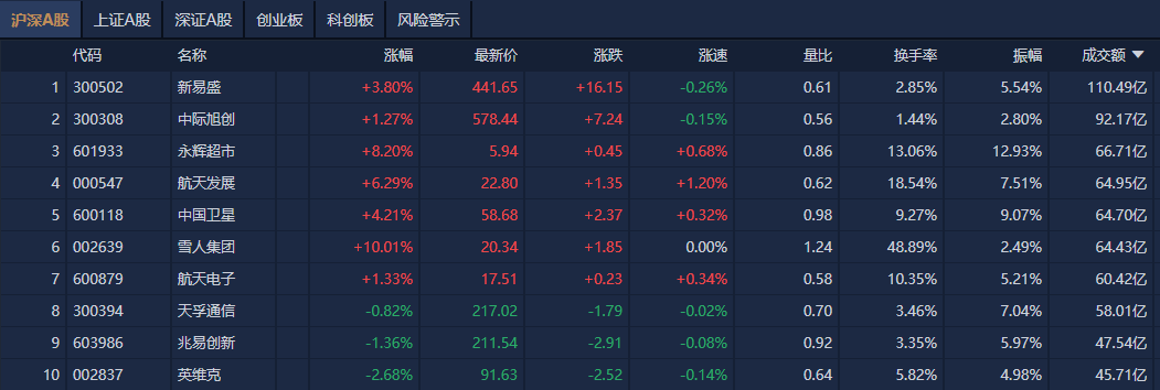 个股方面,新易盛成交额超110亿元居首,中际旭创、永辉超市、航天发展成交额靠前。