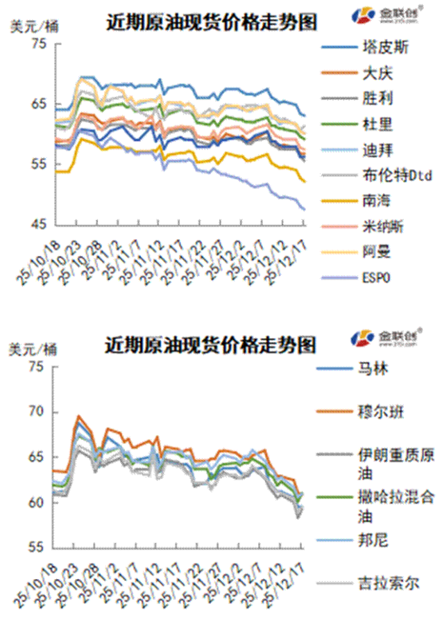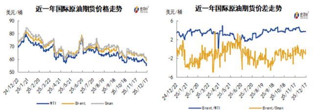 导言:本周(12.11-12.17),国际原油价格整体呈现震荡下行的走势,周度均价环比下跌。WTI均价56.61美元/2.45美元/桶,或-4.15%。周内,导致油价承压的因素有:市场关注美乌谈判以及乌克兰和平协议前景,以及投资者仍在权衡供应过剩情况。对油价起到支撑的因素有:委内瑞拉地缘局势紧张。
