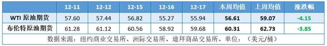 本周(12.11-12.17),原油整体呈现震荡下行的走势,周度均价环比下跌。