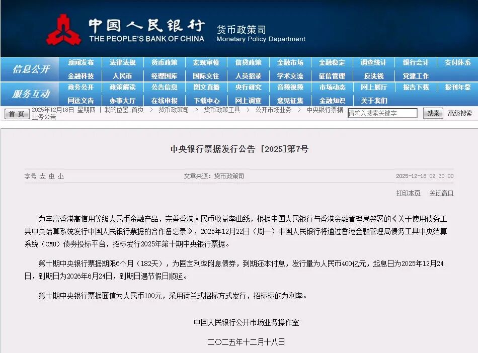 12月18日,中国人民银行发布公告称,为丰富香港高信用等级人民币金融产品,完善香港人民币收益率曲线,根据中国人民银行与香港金融管理局签署的《关于使用债务工具中央结算系统发行中国人民银行票据的合作备忘录》,2025年12月22日(周一)中国人民银行将通过香港金融管理局债务工具中央结算系统(CMU)债券投标平台,招标发行2025年第十期中央银行票据。