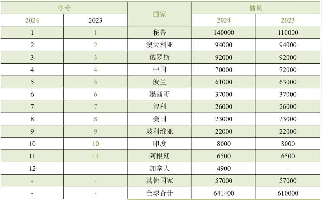 2023—2024年全球白银分国别储量及排名(单位:吨)