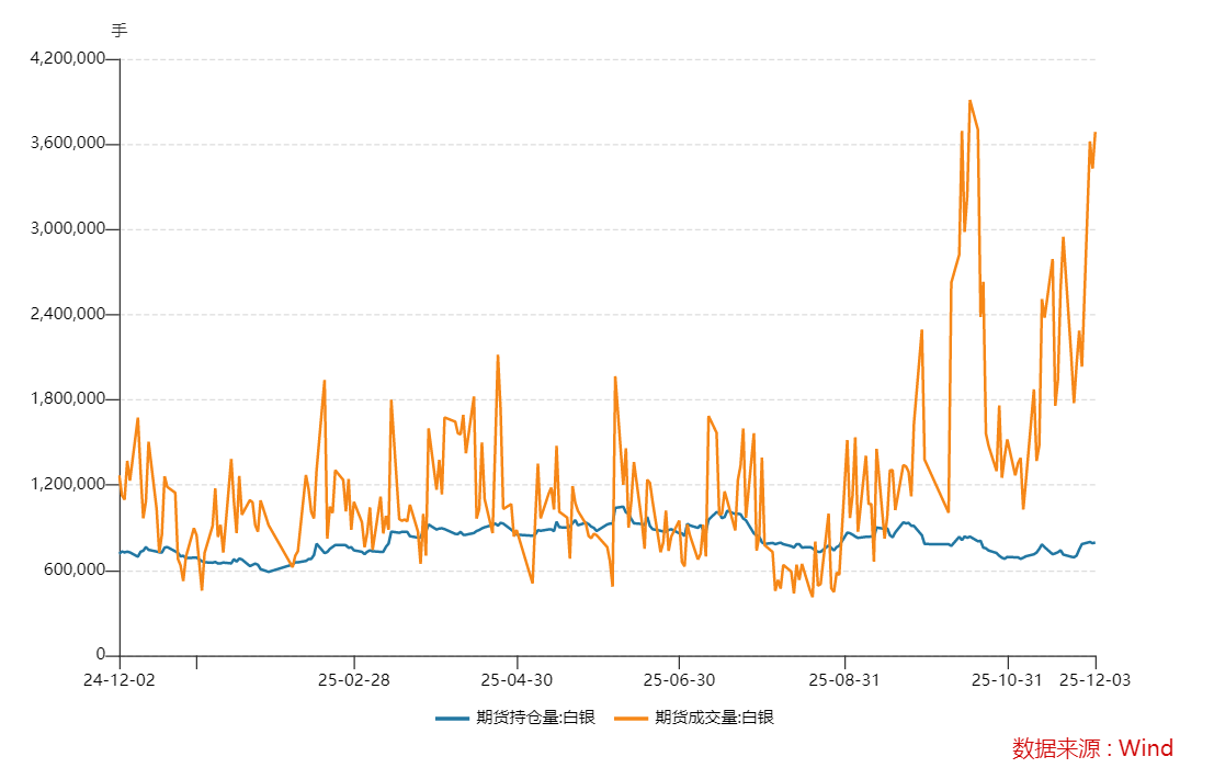 此外,2025年9月开始,美联储的货币政策转向不断降息,则为白银大牛市注入了“强心剂”。叠加美国政治与经济不确定性引发的避险需求,资金加速涌入欧美白银市场。全球白银ETF持仓量半年内增加超500吨,国内白银T+D成交量半年增长30%,投机性多头持仓在9月降息后单月增加12%。