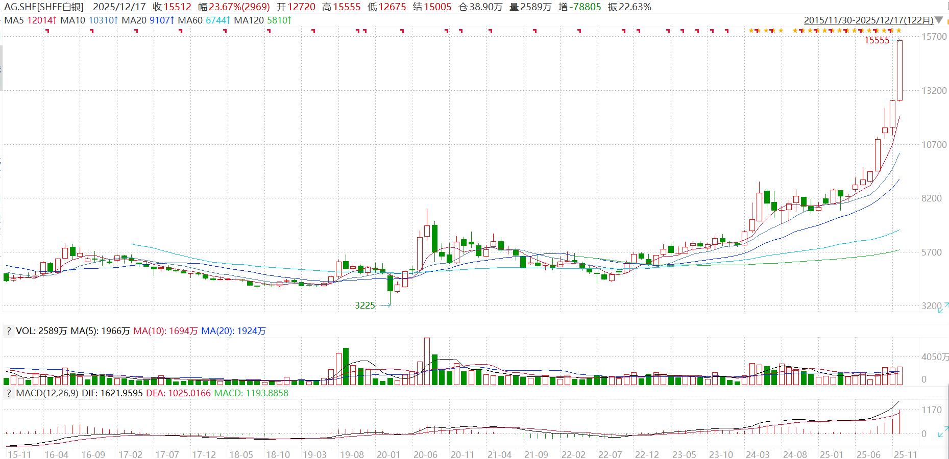 截至2025年12月16日,全球主要交易所白银库存情况如下:纽约商品交易所(COMEX)库存约为14,116吨,伦敦金银市场协会(LBMA)库存11月底约为27,187吨。截至2025年12月17日,上海期货交易所库存约为912吨,这种非常低的库存水位,国内的溢价就是有充分理由的,除非库存连续几周回升到2000吨以上,而11月28日上期所库存仅为558吨的极低水平,从而推动白银价格脱离“地心引力”。
