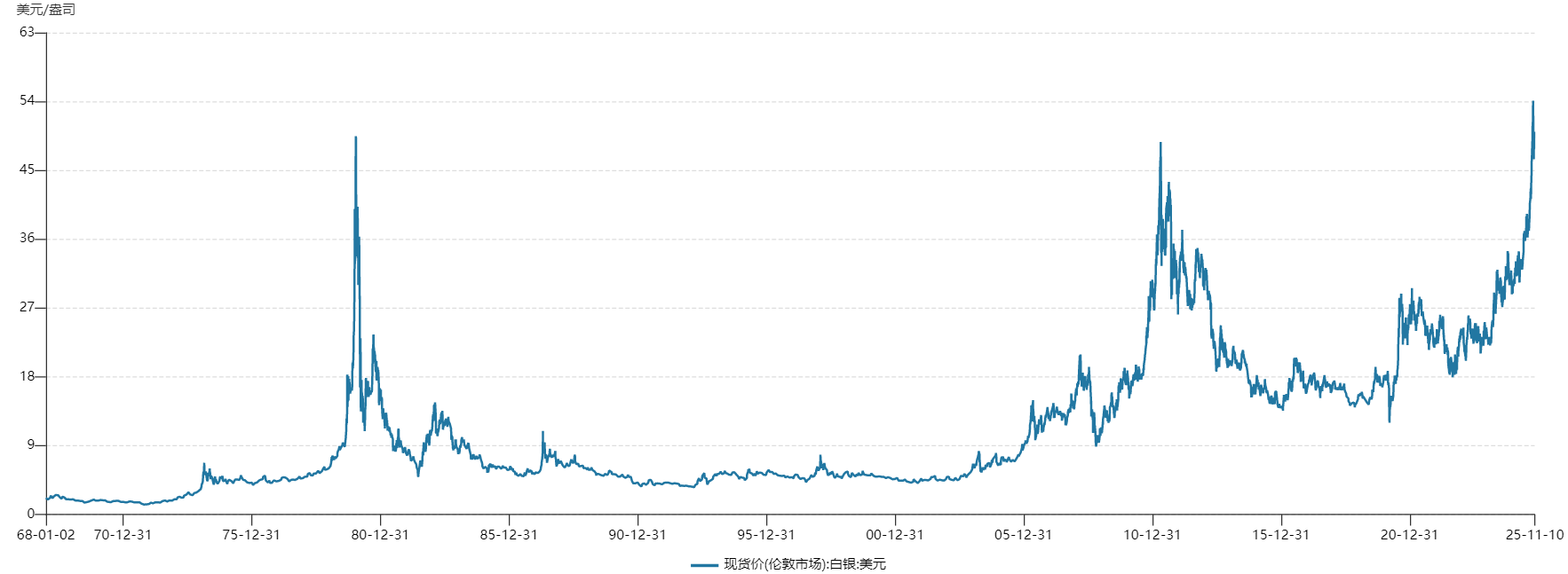 结合宏观经济、货币政策与产业需求等核心驱动因素,过去60年即1965—2025年国际白银期货行情可划分为“低位蛰伏—操纵暴涨—熊市调整—量化驱动—供需共振”五个阶段,呈现工业属性与金融属性交替主导、价格波动剧烈的特征,具体回顾如下: