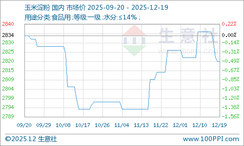 据生意社商品行情分析系统,本周国内玉米淀粉价格小幅回落,周初食用一级玉米淀粉均价为2836.00元/吨,周末均价为2820.00元/吨,周内下跌0.56%。
