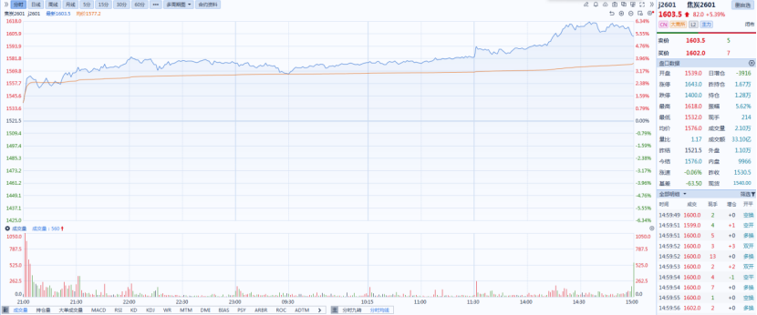 当日(20251218),期货品种焦炭j2601合约呈现强势反弹,最低跌至1532点,最高上涨至1618点,合约价格较上一交易日上涨5.39%,收于1603.5点。成交量21000手,较上一交易日增加5447手,持仓量为12791手,较前一交易日减少3916手。
