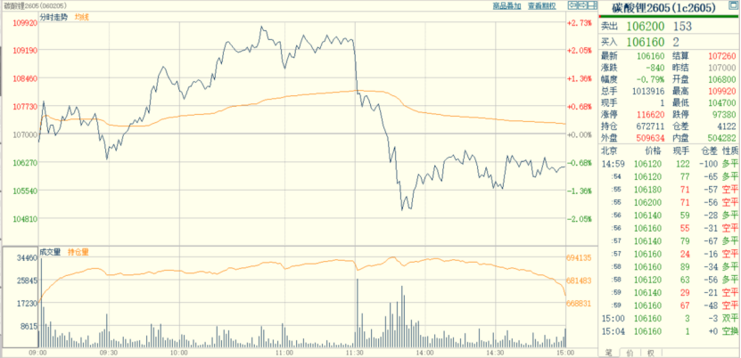 碳酸锂期货12个合约,品种总持仓量1066231手,较上一交易日减少12074手。其中主力合约碳酸锂LC2605,持仓量增加4122手。
