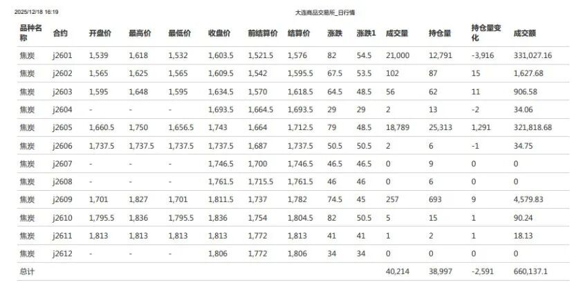 2025年12月18日,焦炭期货主力合约强势反弹,涨幅达5.39%。市场交投活跃度显著回升,价格呈现底部放量拉升态势。当日焦炭价格在成本驱动与市场情绪共振的推动下大幅上行。原料端焦煤价格止跌反弹,成为核心驱动。