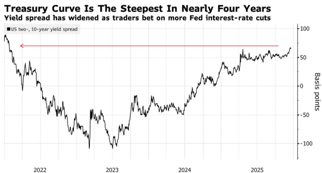 货币市场目前暗示明年将有两次降息,每次降息幅度为25个基点,第三次降息的可能性为40%。市场预期宽松政策将进一步扩大,促使2年期美国国债收益率与10年期美国国债收益率之间的利差扩大至67个基点,创下自2022年1月以来的最大收盘价差距。