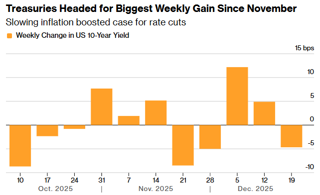 由于美国11月通胀数据意外疲软,失业率飙升,市场预期美联储明年至少会降息两次,美国国债有望迎来自去年11月以来的首次周线上涨。10年期美国国债收益率预计本周将下降约4个基点,而对政策较为敏感的2年期美国国债收益率则跌幅更大,因为市场预期2026年的政策走向将更加鸽派。