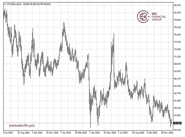 WTI原油在10月20日触及的56美元低点附近徘徊,下行楔子形态正在形成。有鉴于此,接下来可能会跌破55美元。