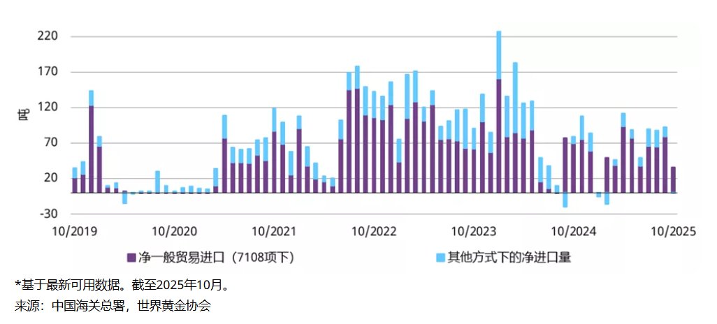 10月,中国净进口黄金约36吨(图6),月环比减少57吨,年同比减少43吨。2025年国庆节和中秋节叠加的八天长假导致工作日减少,是抑制黄金进口的关键因素。此外,11月有一半时间上海-伦敦金价价差为负,进一步削弱了进口商的积极性。而今年以来金饰板块的整体疲软态势,也导致黄金进口量低于往年同期水平。