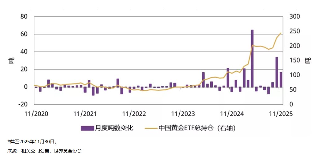 11月,中国市场黄金ETF吸引资金约160亿元人民币(约合22亿美元,17吨),实现连续第三个月流入,且远高于2024年月均26亿元人民币的水平。当月,中国市场黄金ETF资产管理总规模月环比增长10%,达到2,310亿元人民币(约合290亿美元),其持仓量当月增长7%至244吨,以金额和吨位计均刷新月末记录(图3)。我们认为,推动黄金ETF投资需求增强的因素与上述支撑实物金条销售的因素相类似。