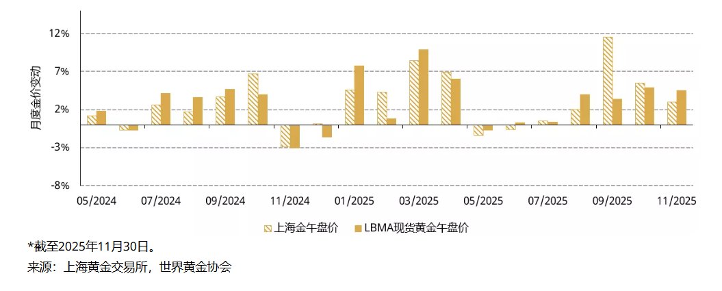 上海金SHAUPM午盘价和伦敦LBMA现货黄金午盘价的月度回报率*