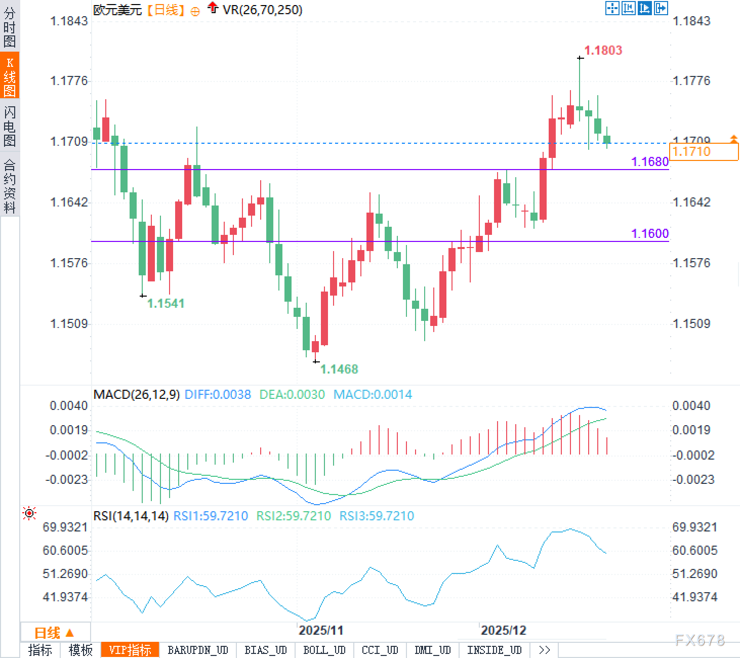 欧元兑美元本周的轨迹呈现典型的“冲高后回撤、但未破坏中期修复结构”的形态。技术图形上,汇价在1.1800上方录得阶段高点后回落至1.1700附近,短线多头动能降温明显。日线层面可见的关键区域集中在1.1680与1.1600附近:前者更像是近期上行通道中的回踩位置,后者则对应更强的结构支撑区。上方而言,1.1700至1.1800区间已被市场反复交易,前高附近自然会成为资金重新评估风险回报的“定价密集带”。
