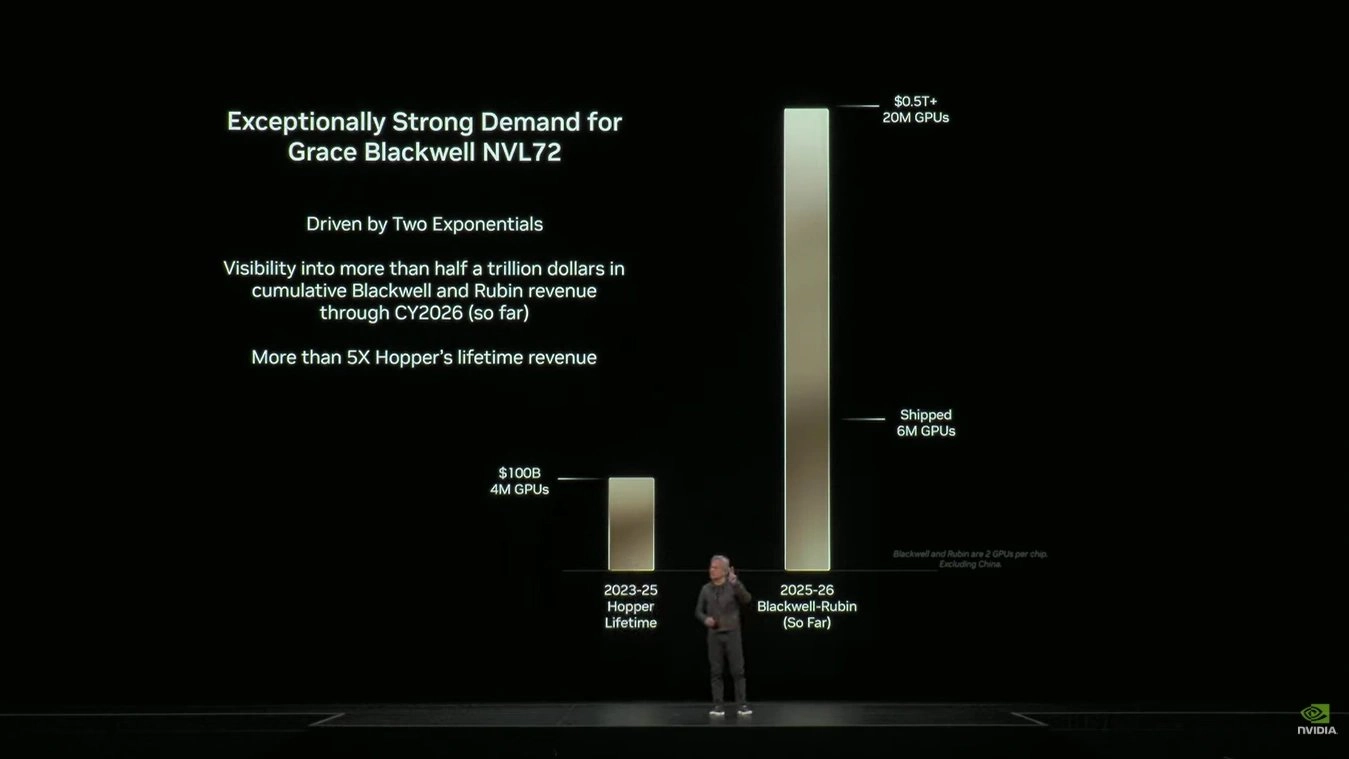 据 CNBC报道,黄仁勋曾在2025年10月表示,英伟达在过去四个季度内出货了600万颗Blackwell GPU,并预计Blackwell系列与下一代Rubin架构合计将实现5000亿美元(IT之家注:现汇率约合3.53万亿元人民币)的GPU销售额。