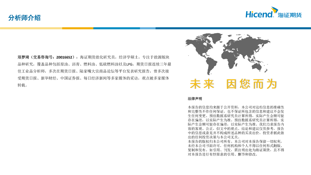 郑梦琦(交易咨询号:Z0016652):海证期货能化研究员,经济学硕士,专注于能源版块品种研究,覆盖品种包括原油、沥青、燃料油、低硫燃料油以及LPG,期货日报第十五届、第十六届最佳工业品分析师,多次在期货日报、陆家嘴大宗商品论坛等平台发表研究报告,曾多次接受期货日报、新华财经、中国证券报、每日经济新闻等多家媒体的采访,观点被多家媒体转载。