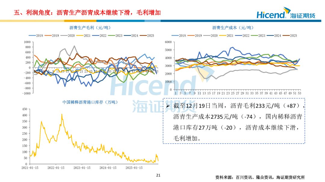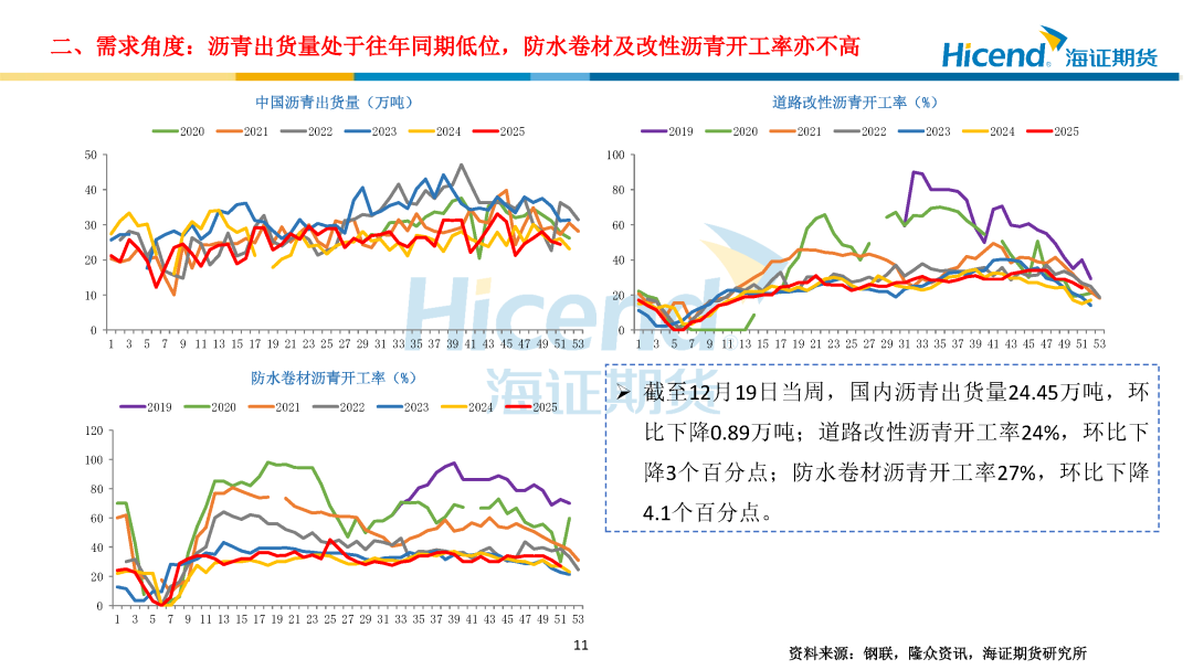 需求端:截至12月19日当周,国内沥青出货量24.45万吨,环比下降0.89万吨;道路改性沥青开工率24%,环比下降3个百分点;防水卷材沥青开工率27%,环比下降4.1个百分点,沥青出货量处于往年同期低位,防水卷材及改性沥青开工率亦不高。赶工需求逐步减少,沥青出货量低位,除西北冬储陆续入库外,其余地区偏观望。