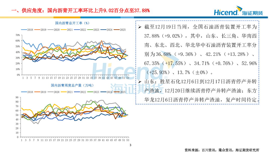 供应端:截至12月19日当周,全国石油沥青装置开工率为37.88%,环比上升9.02个百分点,沥青周产量环比增加9.43万吨至55.33万吨。山东地区的胜星石化间歇生产沥青,12月6日到12月17日沥青停产并转产渣油,12月20日继续沥青停产并转产渣油;东方华龙12月6日沥青停产并转产渣油,复产时间待定。