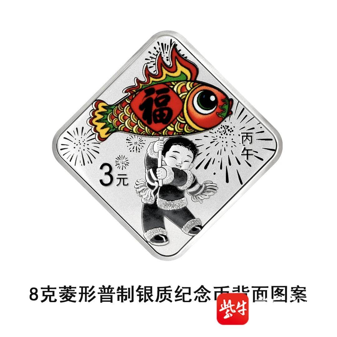 金银纪念币的设计更侧重“福文化”表达。1克圆形金质纪念币背面将“福”字与荷包组合;8克菱形银质纪念币则以“福”字与舞鱼灯场景为核心,鱼灯巡游是多地春节庙会的经典场景,寓意“年年有余”,而菱形也呼应了民间贴福字的传统习惯。