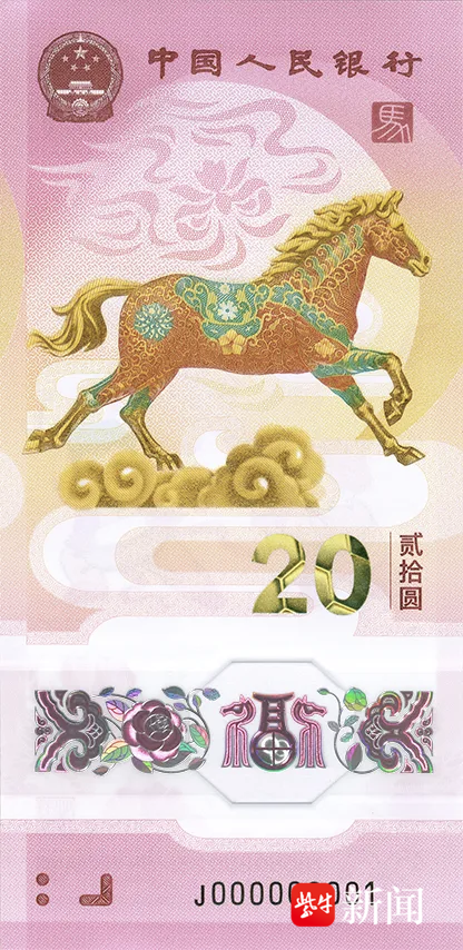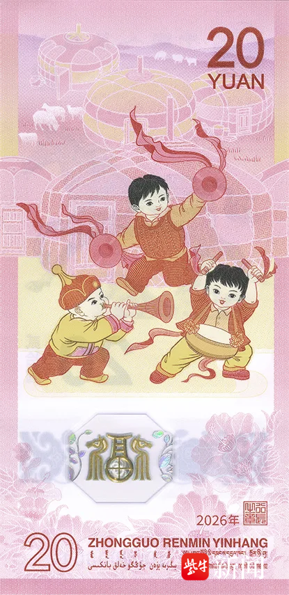 纪念钞正面主景是马的造型,上方搭配国徽、“中国人民银行”字样和篆书“马”字印章,下方的光彩光变面额数字“20”、动感全息图案等元素,既保证了防伪性能,也让整体视觉更具层次感。背面则聚焦新春欢庆场景,以儿童欢庆锣鼓图案为主景,辅以蒙古包装饰,下方不仅有花卉与动感全息图案,还涵盖了蒙、藏、维、壮四种民族文字的“中国人民银行贰拾圆”字样。
