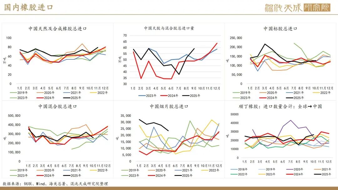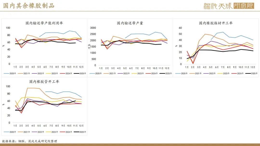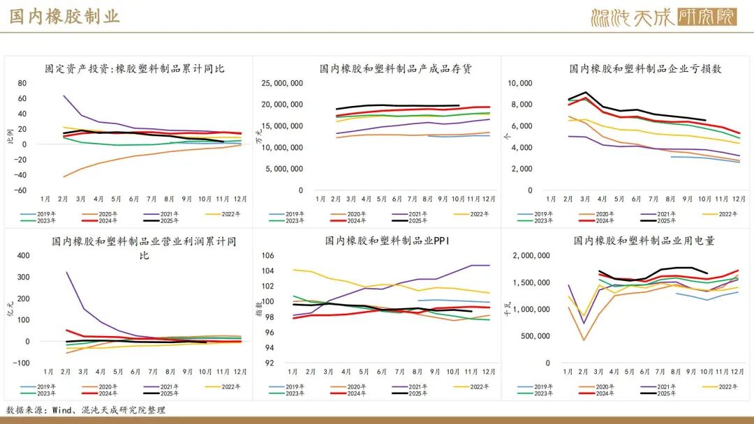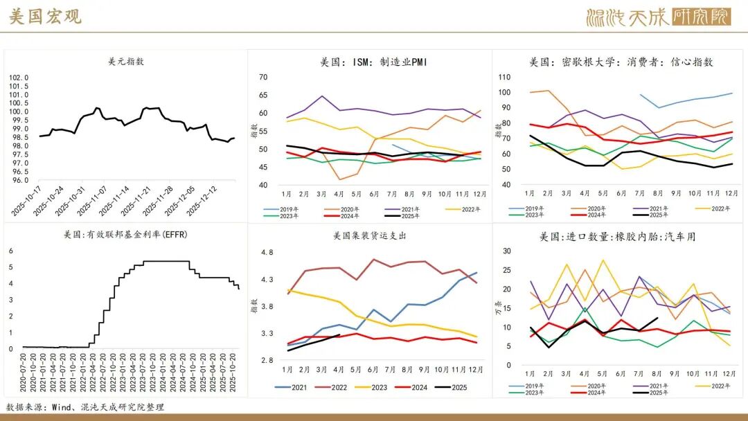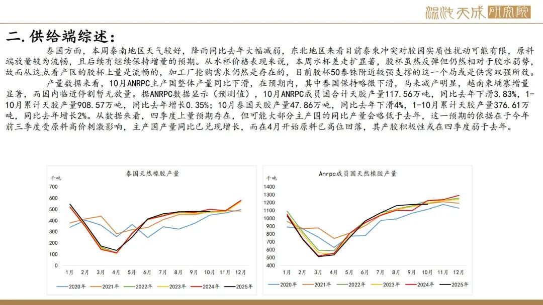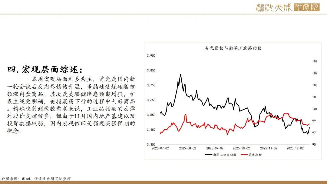 本周宏观层面利多为主,首先是国内新一轮会议后反内卷情绪升温,多晶硅焦煤碳酸锂领涨内盘商品;其次是美联储降息预期增强,扩表主线更明确,美指震荡下行的过程中利好商品。精确映射到橡胶需求来说,工业品指数的反弹对胶价支撑较多,但由于11月国内地产基建以及投资数据较弱,国内宏观依旧是弱现实强预期的概念。