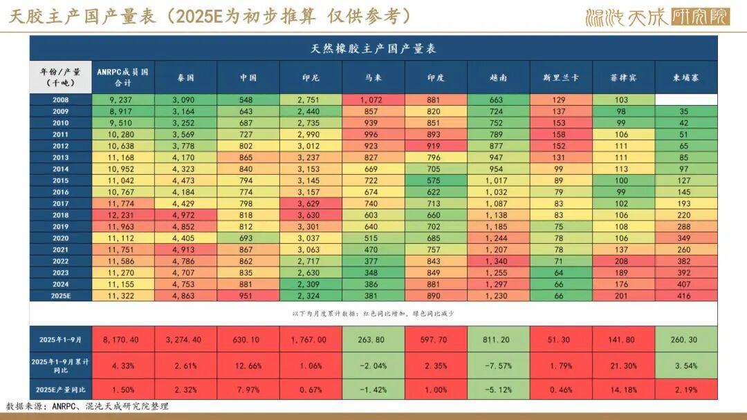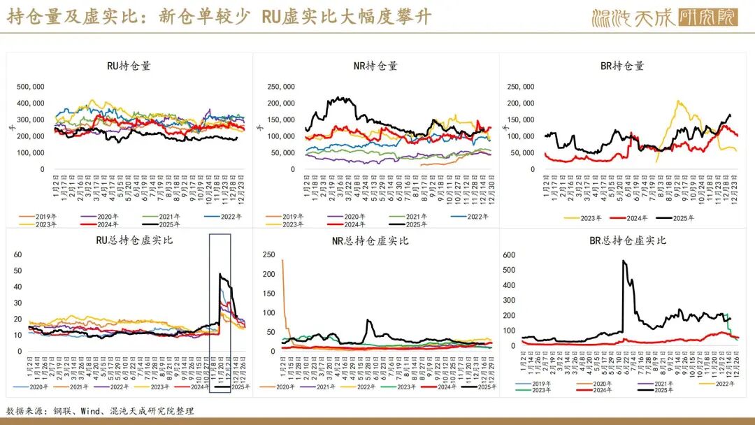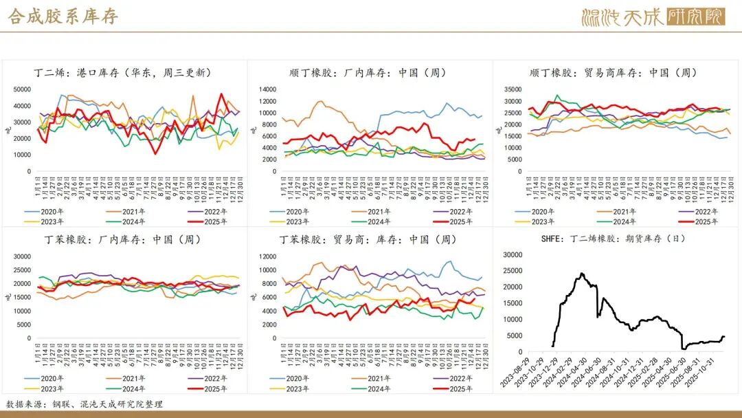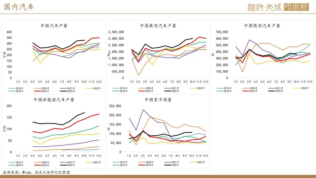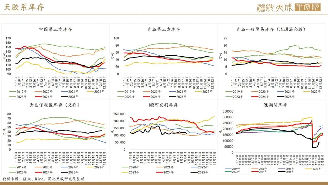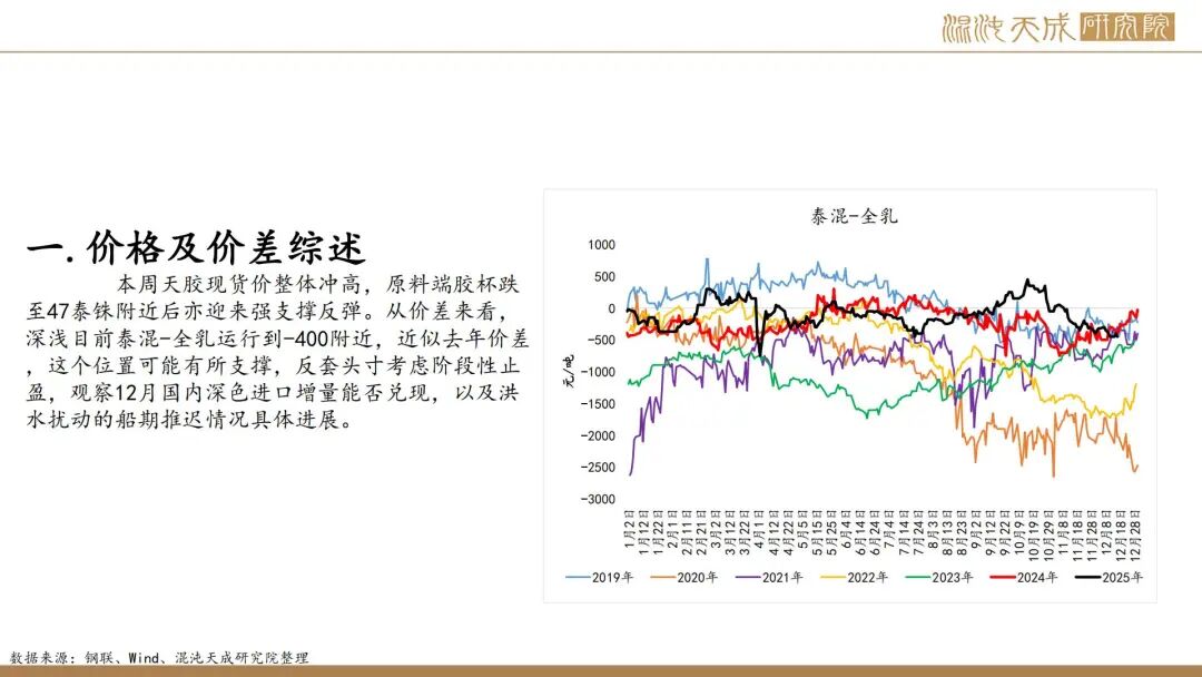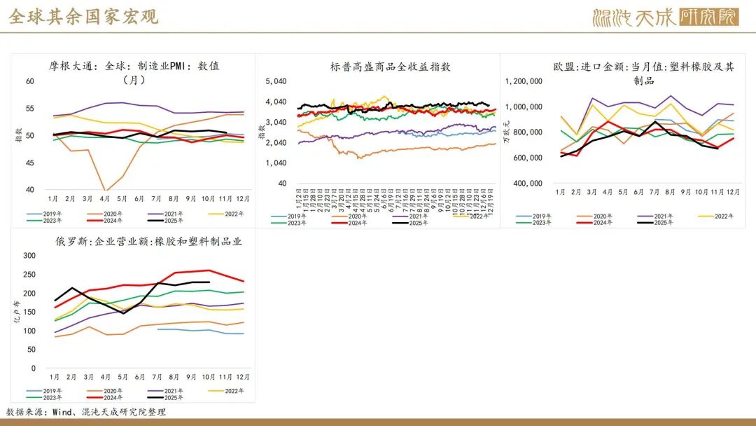 本周宏观层面利多为主,首先是国内新一轮会议后反内卷情绪升温,多晶硅焦煤碳酸锂领涨内盘商品;其次是美联储降息预期增强,扩表主线更明确,美指震荡下行的过程中利好商品。精确映射到橡胶需求来说,工业品指数的反弹对胶价支撑较多,但由于11月国内地产基建以及投资数据较弱,国内宏观依旧是弱现实强预期的概念。