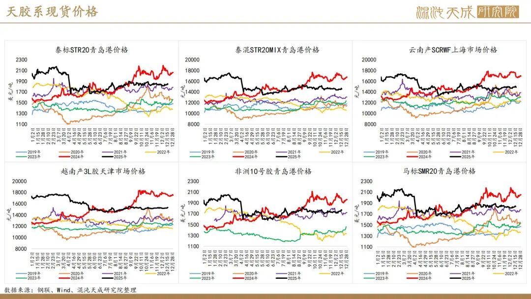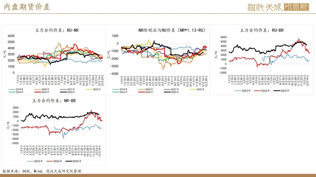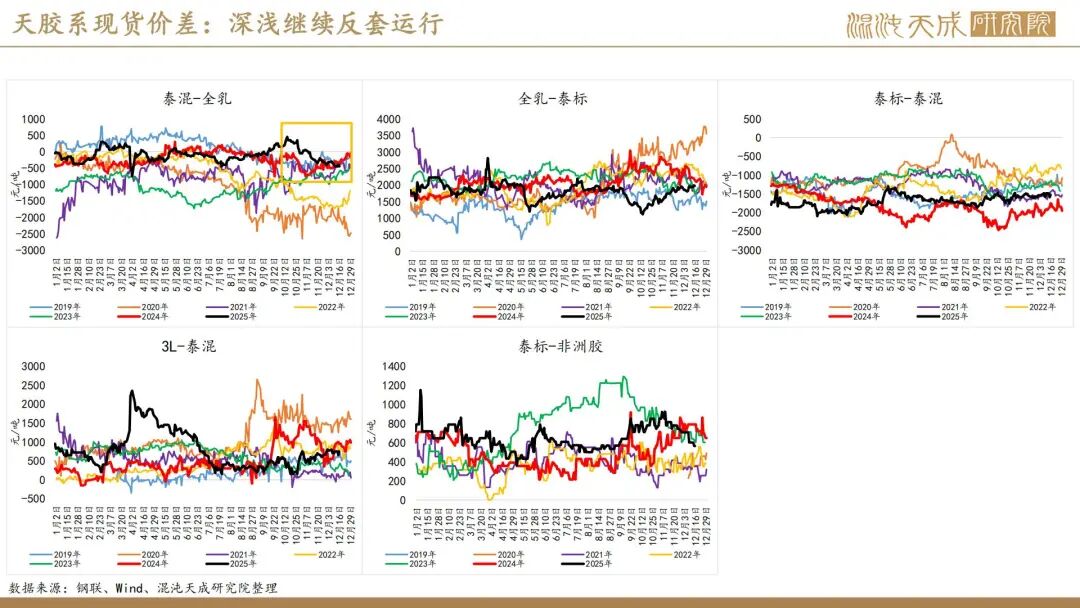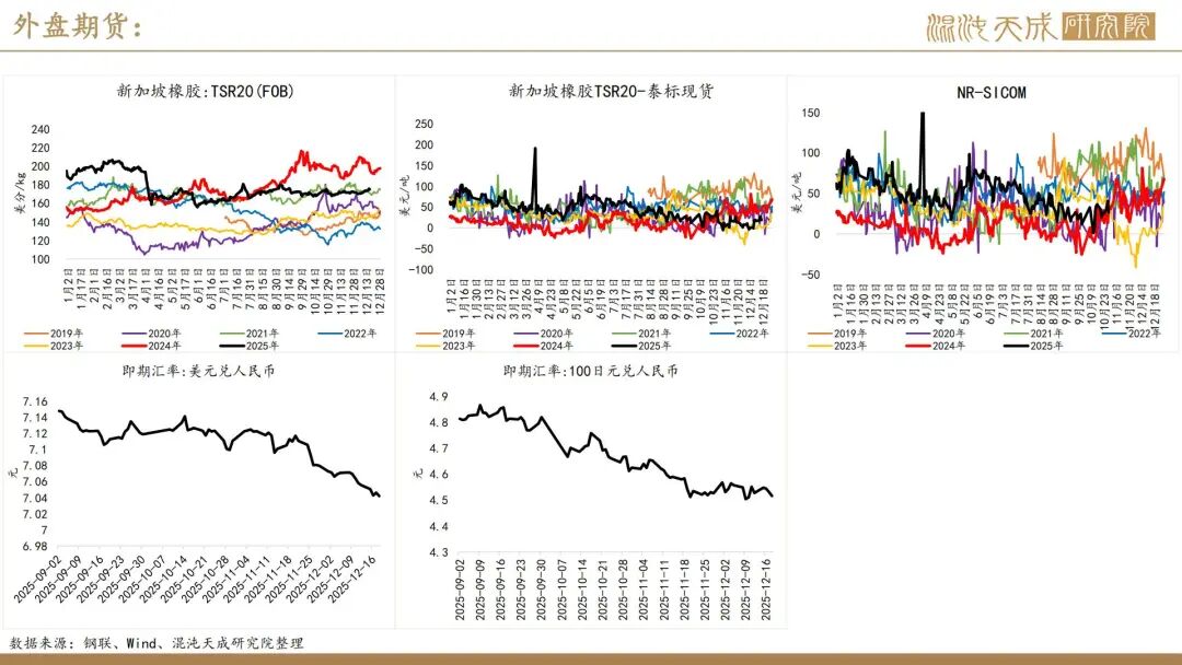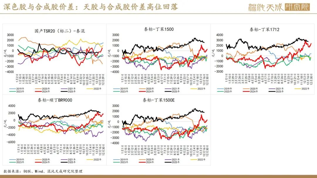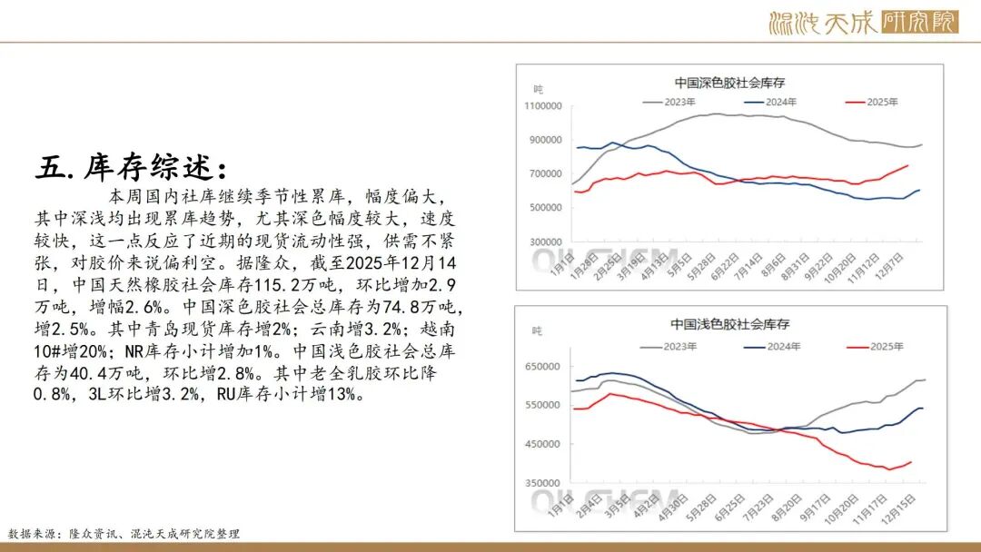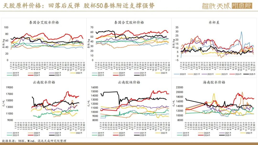 泰国方面,本周泰南地区天气较好,降雨同比去年大幅减弱,东北地区来看目前泰柬冲突对胶园实质性扰动可能有限,原料端放量较为流畅,且后续有继续保持增量的预期。从水杯价格表现来说,本周水杯差走扩显著,胶杯虽然反弹但仍然相对于胶水弱势,故而从这点看产区的胶杯上量是流畅的,加工厂抢购需求仍然是存在的,目前胶杯50泰铢附近较强支撑的这一个局或是供需双强所致。