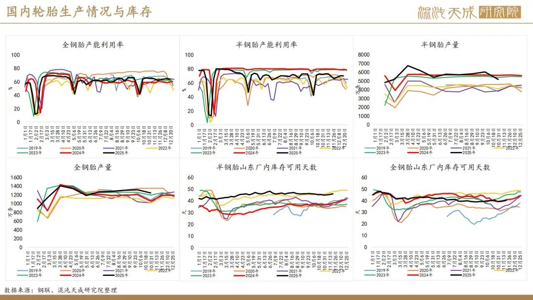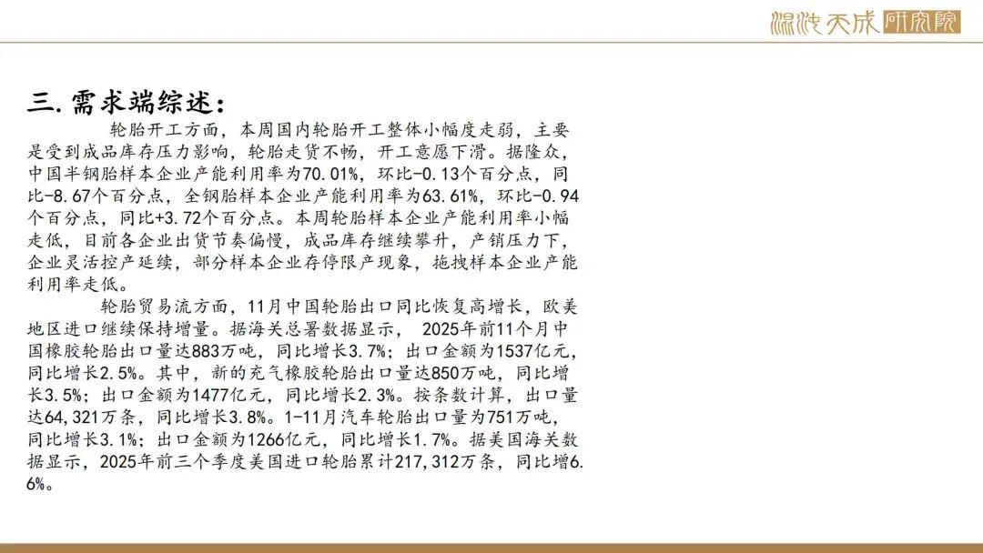 半钢胎方面,本周期半钢胎替换市场持续疲软,企业让利去库存导致利润收窄。终端分化:四季胎刚需走货,渠道补货积极性低;雪地胎受降雪带动短期热销,国产品牌占主流。一级代理商库存积压、周转放缓,进货意愿低迷。