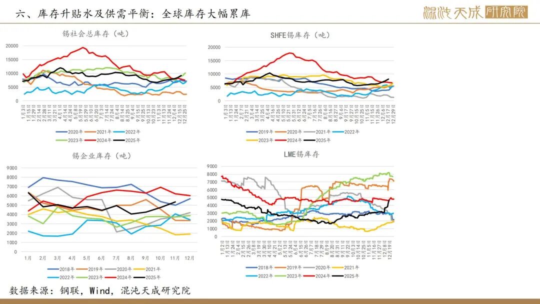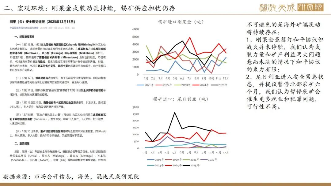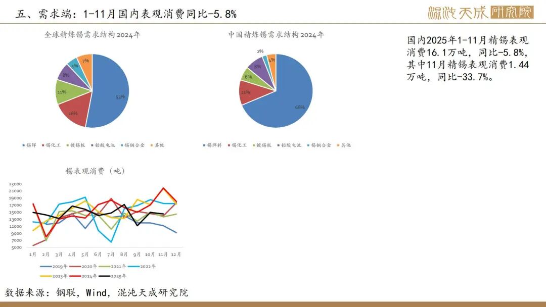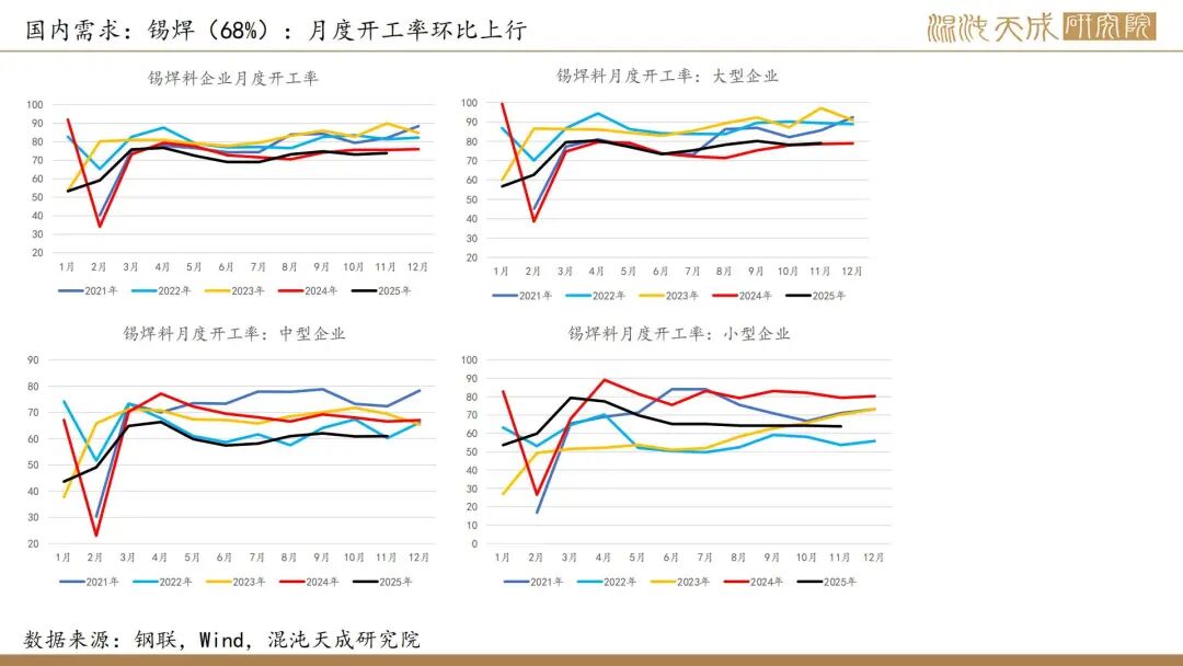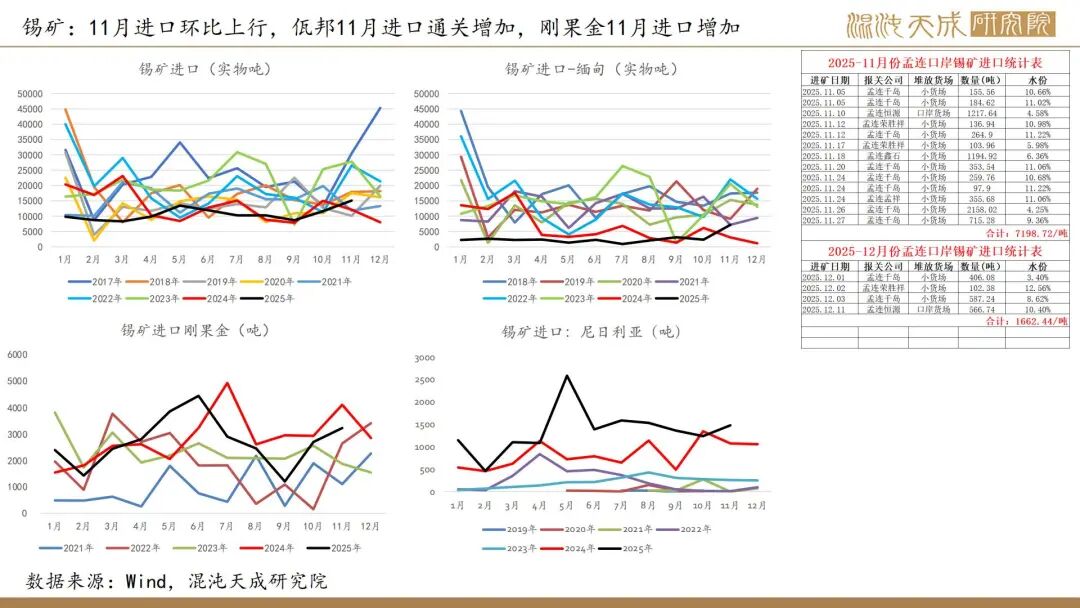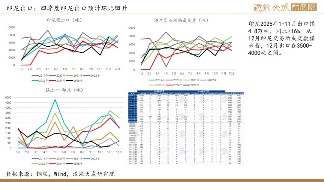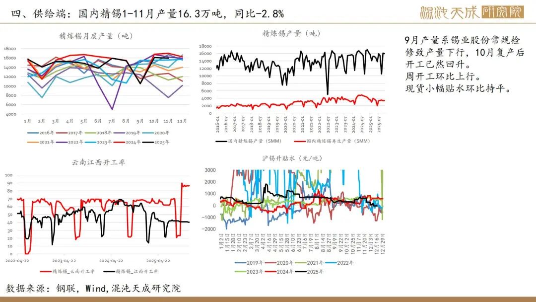 原料端国内锡矿1-9月产量5.65万吨,同比+1.9%,1-11月锡矿进口11.8万实物吨,同比-21.7%,其中11月进口锡矿15099实物吨,环比大幅增加,主要系佤邦复产增加。刚果金当地紧张局势在和平协议签订后仍未缓解,据钢联和SMM,阿尔法明锡矿生产和运输暂未受到影响。虽然矿端供应的担忧因战乱的不确定性将持续存在,但11月刚果金锡矿进口环比上行会打压矿端出现扰动的预期。国内TC低位持平,锡矿供应短期仍偏紧。国内精锡2025年1-11月产量16.3万吨,同比-2.8%,周度开工率环比上行,现货小幅贴水环比持平。印尼11月精锡出口明显回升。