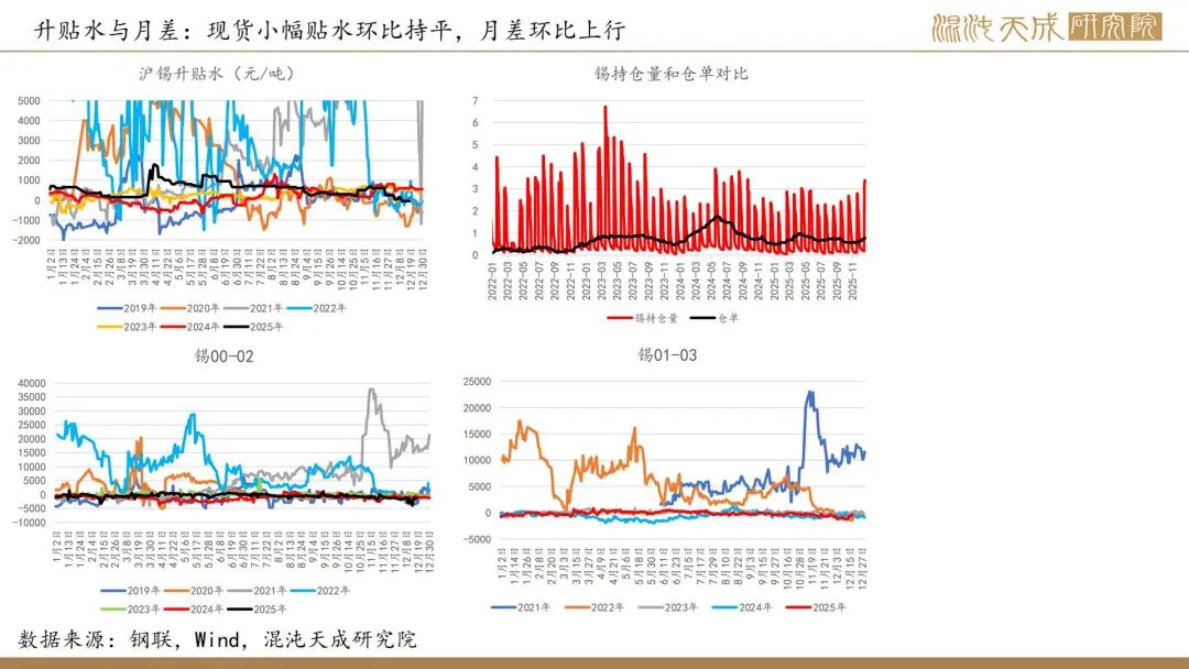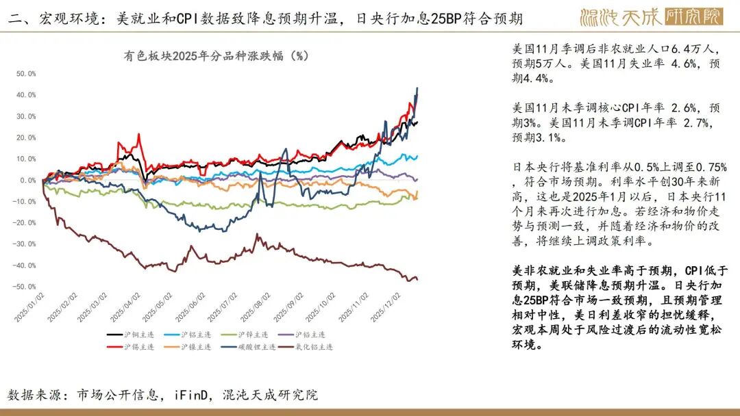 本周美就业和CPI数据致降息预期升温,日央行加息25BP符合市场预期,且预期管理相对中性,流动性风险缓释。刚果金当地紧张局势在和平协议签订后仍未缓解,据调研当地锡矿生产和运输暂未受到影响。虽然矿端供应的担忧因战乱的不确定性将持续存在,但11月刚果金锡矿进口环比上行会打压矿端出现扰动的预期。国内现货小幅贴水维持,全球库存交仓行为增多,库存大幅累库,产业负反馈明显,锡价短期上行会承压,全球降息背景+矿端供应扰动难以消弭下仍可逢低多配。