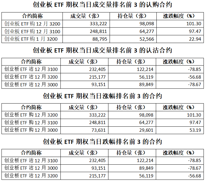 创业板ETF期权总成交面额692.52亿元,增加4.53%,期现成交比为0.37,权利金成交额11.22亿元;期权总成交量2,236,848张,增加2.28%,其中认购期权成交量1,174,337张,认沽期权成交量1,062,511张,认沽认购成交比率为0.90(上一交易日认沽认购成交比率为0.92)。