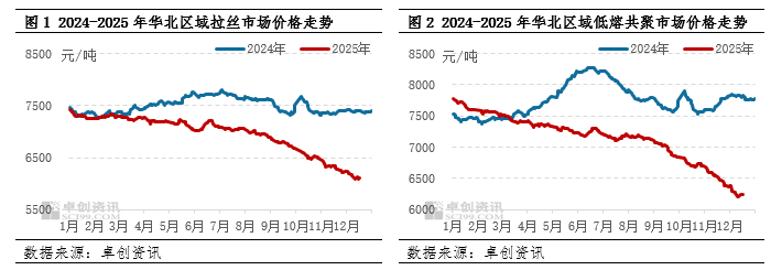 进入12月份,华北区域PP市场价格延续跌势,价格重心继续下移。据卓创资讯数据监测,截至2025年12月18日,华北区域拉丝市场价格收于6110元/吨,较11月底下跌1.69%;月均价在6157.86元/吨,环比下跌2.48%;低熔共聚市场价格收于6250元/吨,较11月底下跌1.96%;月均价在6278.93元/吨,环比下跌3.82%。华北PP市场延续跌势的主要影响因素为基本面表现欠佳,其中弱需求对PP现货价格拖累尤为明显。