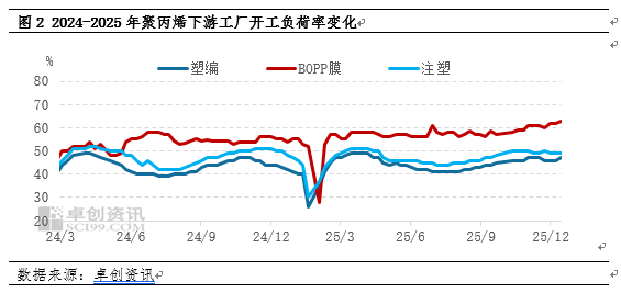 据卓创资讯统计,截至2025年12月18日,塑编行业周均开工约在47%,较上月底提升1个百分点;BOPP行业周均开工约在63%,较上月底提升1个百分点;注塑行业周均开工约在49%,较上月底持平。PP部分下游领域开工负荷率略有提升,主要在于年底终端集中订单释放,刚需支撑力度保持稳定,但区域分化特征显著。聚焦到华北区域来看,受环保检查影响,部分塑编、无纺布工厂开工负荷有所走弱,同时下游工厂成品库存整体处于中性偏高水平,基于后期去库压力,下游工厂开工负荷后续难有明显提升意愿。叠加华北PP价格持续弱势,下游工厂“恐跌”较重,同时前端低价预售资源陆续到厂,现货采购积极性欠佳,需求端支撑乏力。